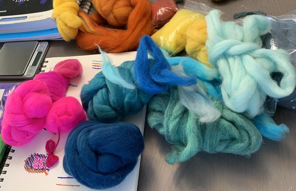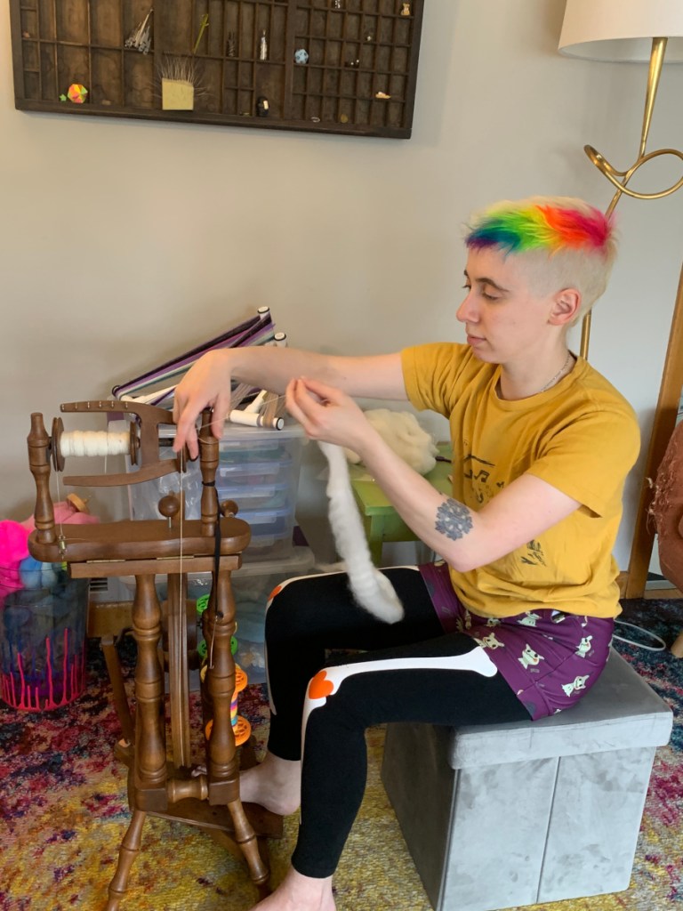 It all starts with fiber! From a farm, indie dyer, or craft supply, I usually get it as roving or top (cleaned, combed, and loosely organized into a rope shape). I fluff, strip, and attenuate it to help it spin smoothly.