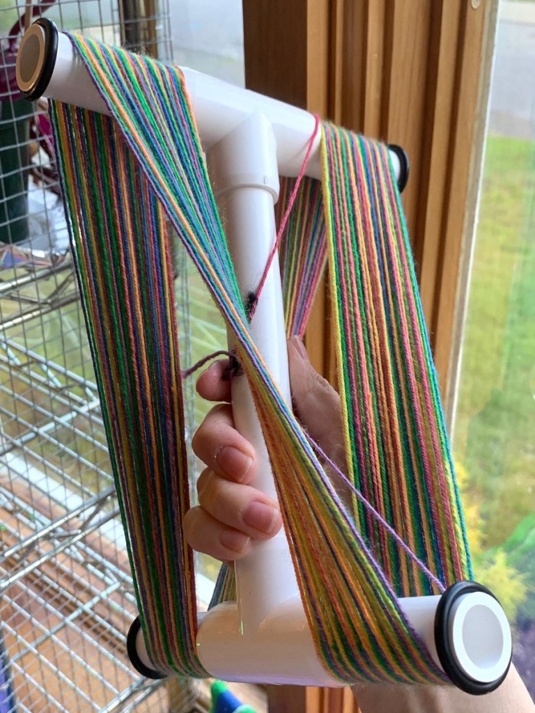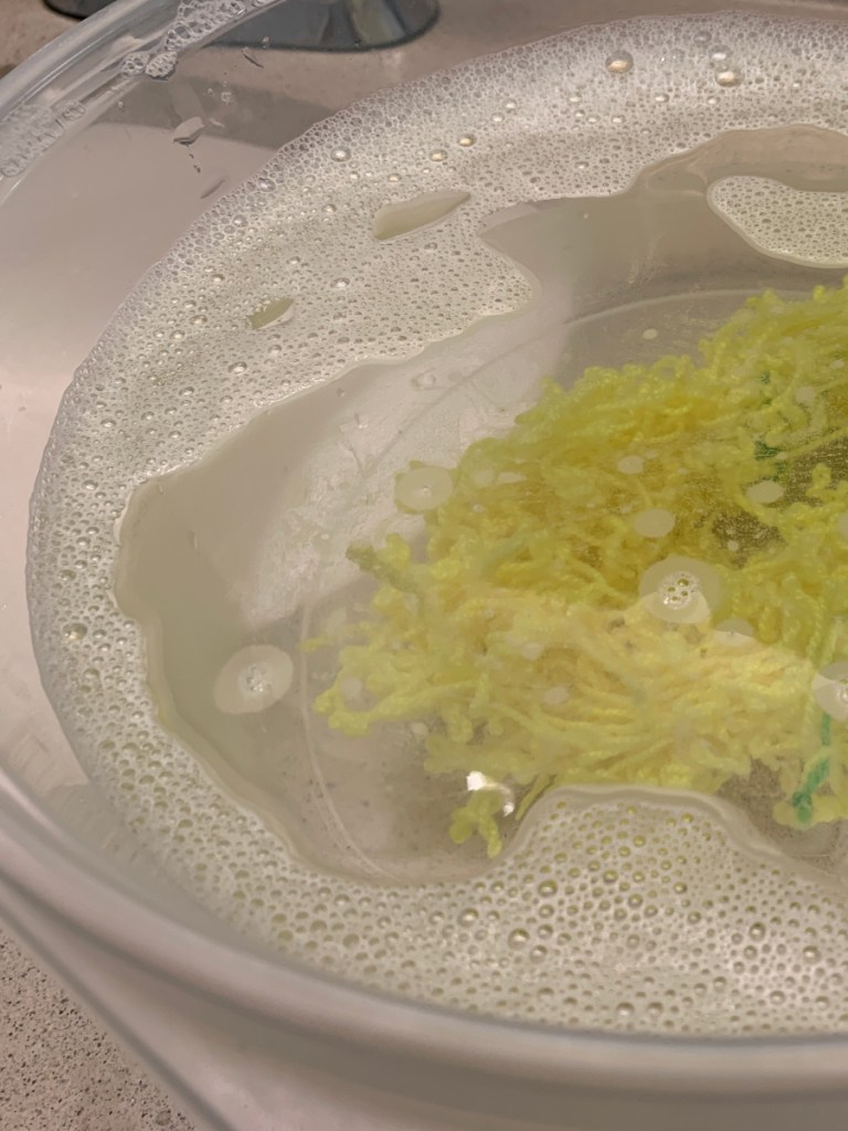 Once it’s done resting, I use a niddy noddy to skein the string and add lease ties so it doesn’t tangle up. The skein gets a soak in its own little mikveh (bucket of warm water and wool wash). After taking it out, I snap it between my arms to even it out and help it hold together. Then it’s back onto the niddy to dry under tension!