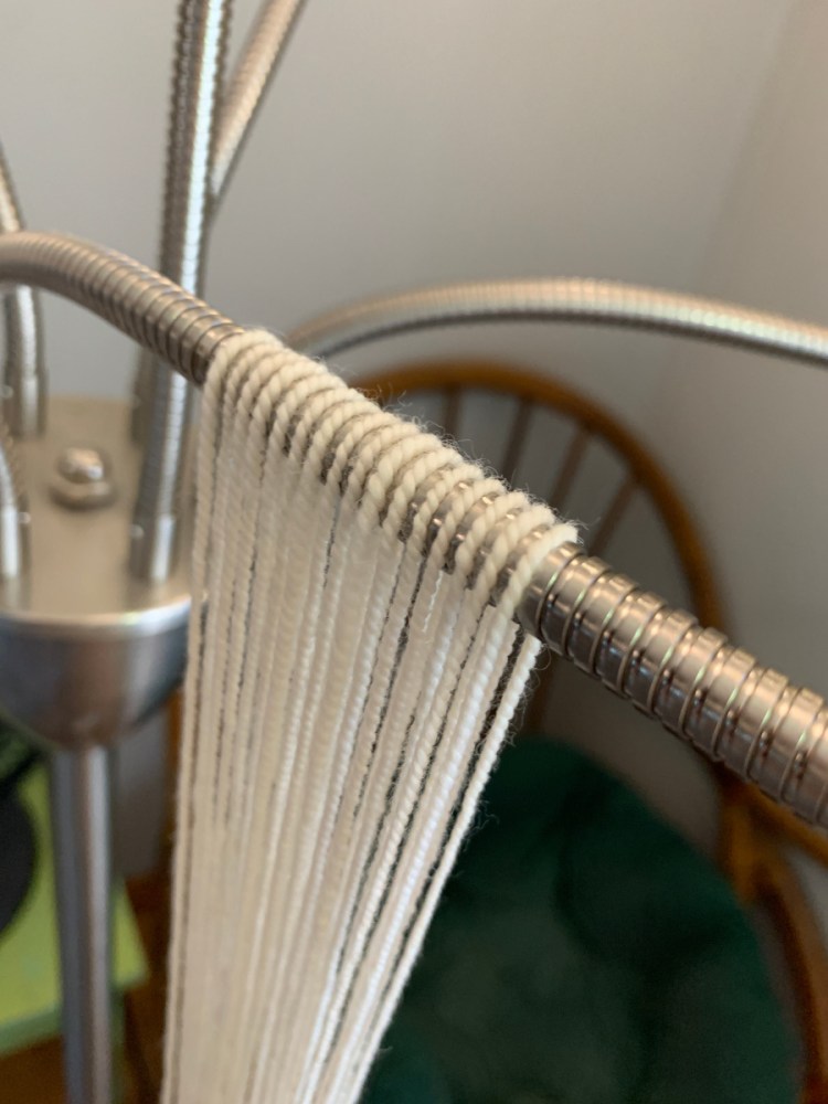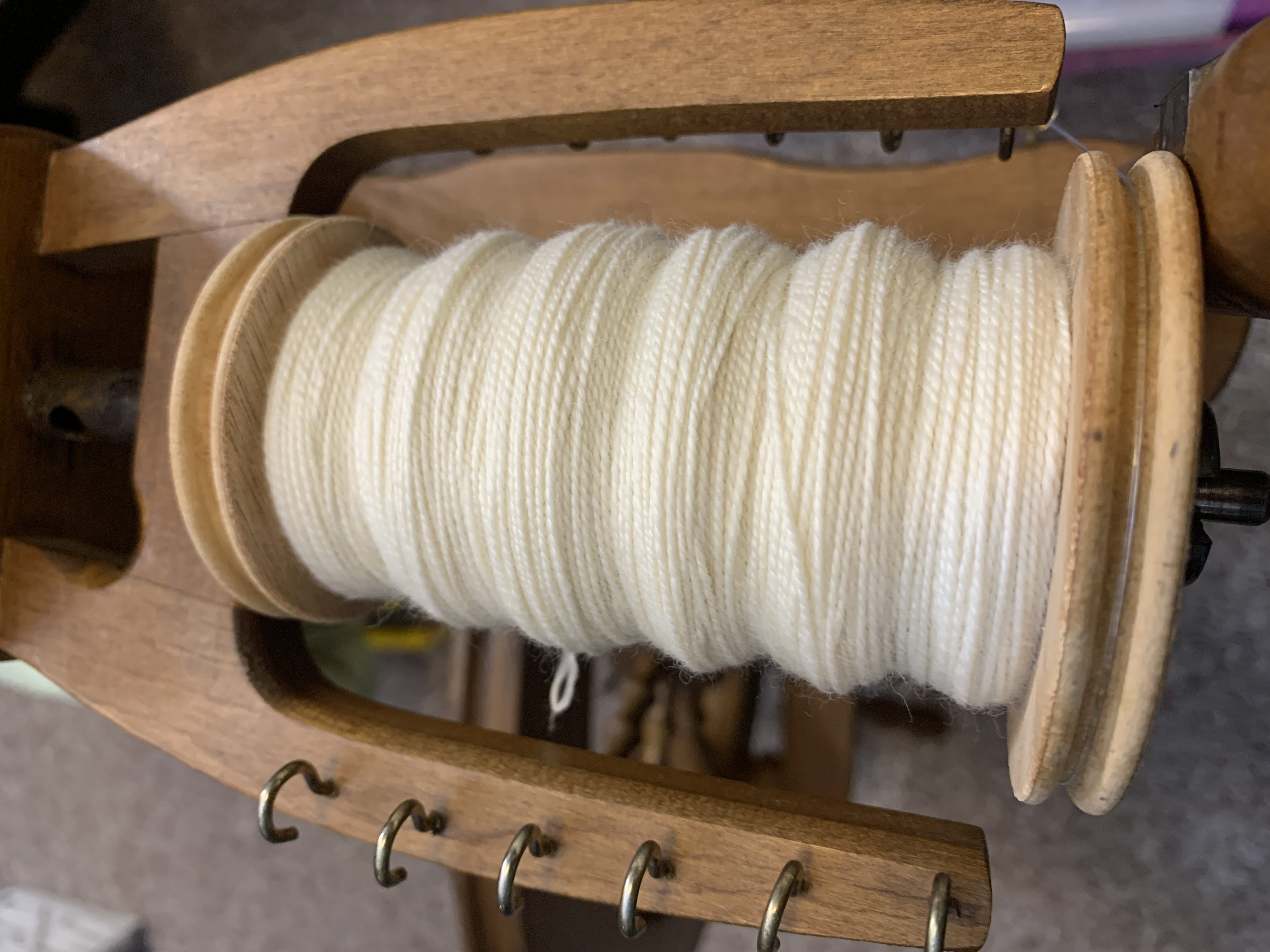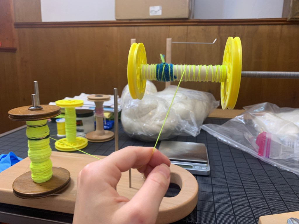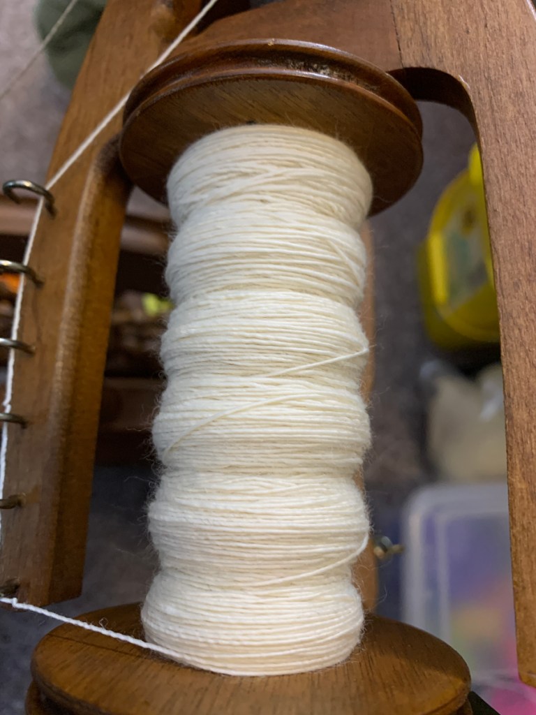 I weigh the single thread, then split it in half, rewinding each half onto a transfer bobbin. After that, I put the two bobbins on my lazy kate and start plying! The width of the plied string is usually around 18 wpi.