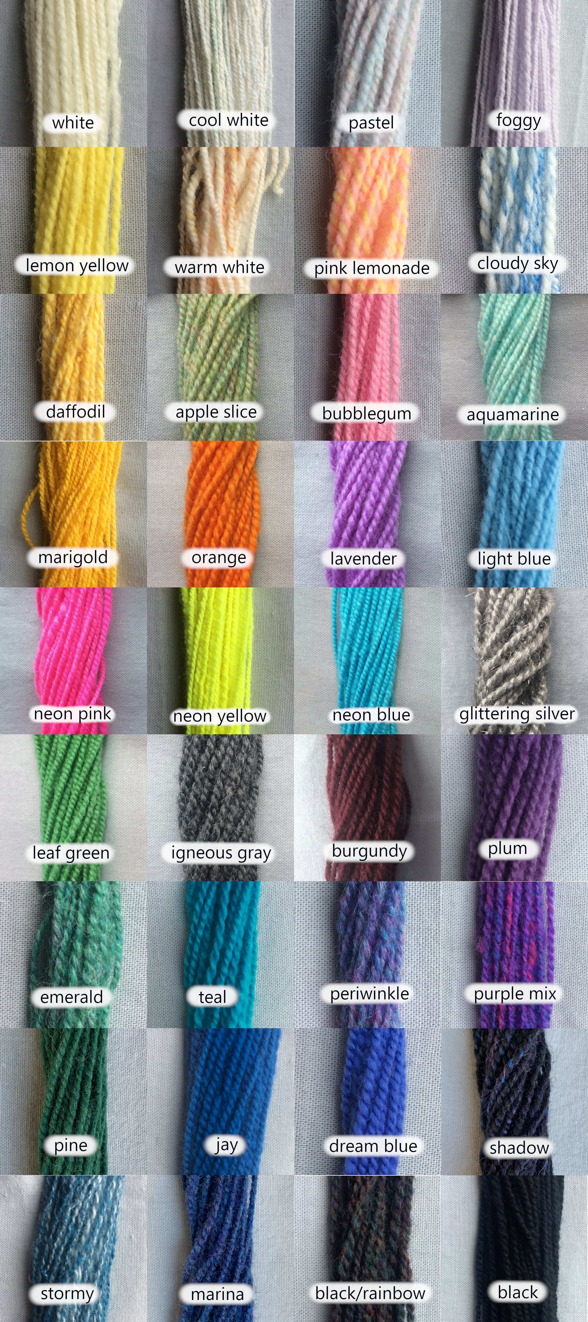 - Color: natural/undyed, or anything I can find or blend! The sky’s the limit, but here are some colors I’ve done before.